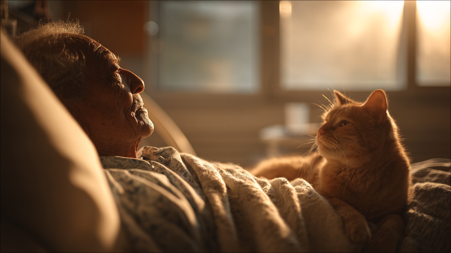 Three days later, Walter opened his eyes to soft sunlight filtering through the curtains. The world was warm again. His throat felt dry, but his heart beat steady. When he turned his head, he froze. There, sitting on the blanket by his arm, was the same little orange cat—tail wrapped neatly around its paws, eyes calm and watchful. When it saw him move, it let out a soft, almost relieved, meow.