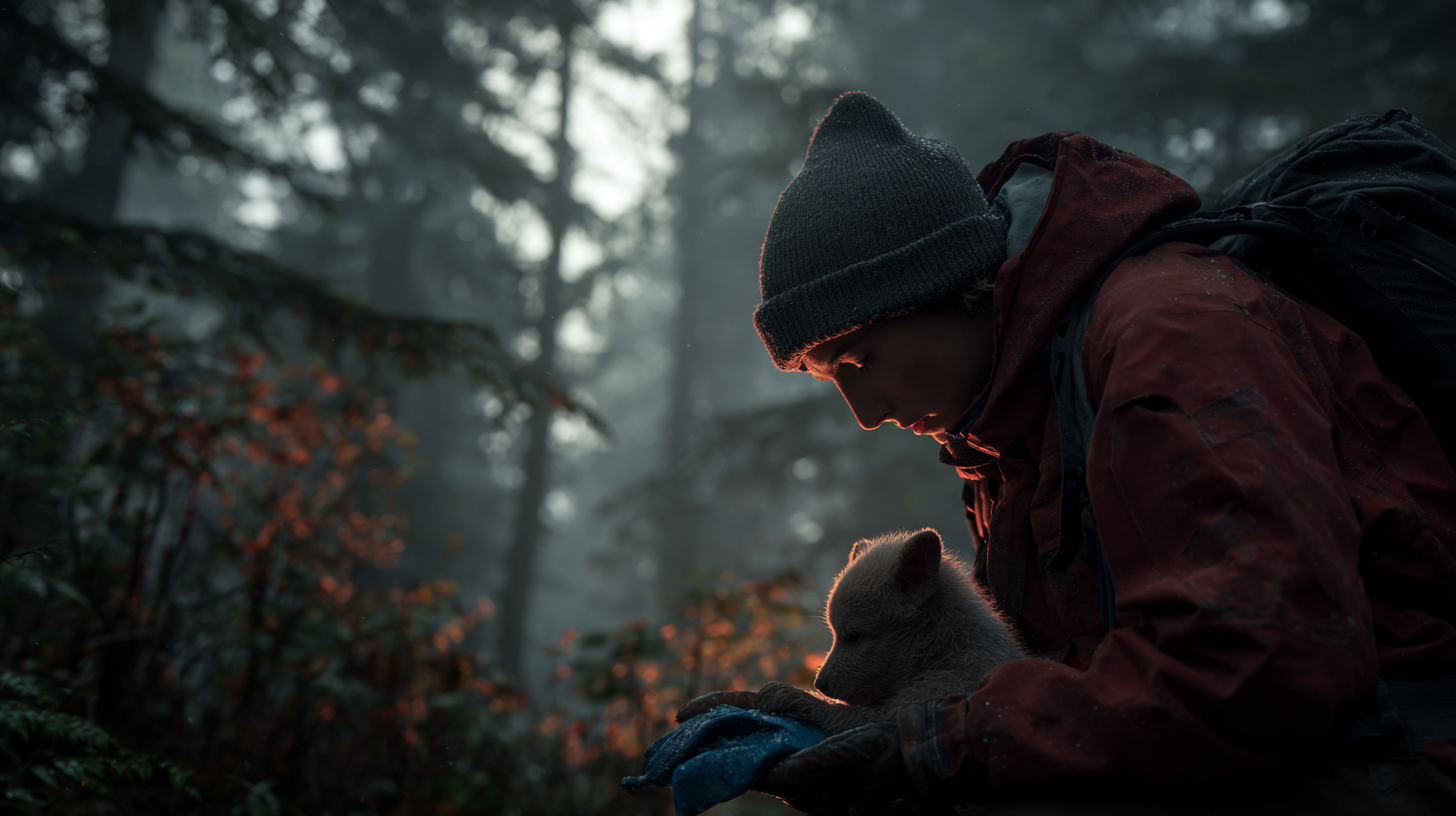 Inside was a tiny puppy, muddy and trembling, no bigger than his forearm. The little creature whimpered, barely clinging to warmth. Ryan blinked in disbelief. A bear had carried this fragile thing to him. Why? He slipped off his jacket and wrapped the puppy tightly, holding it against his chest. The small heartbeat against his ribs was faint but steady. “You’re safe now,” he whispered, his voice breaking. He looked toward the trees, hoping to see the bear again, but the forest had swallowed her whole.